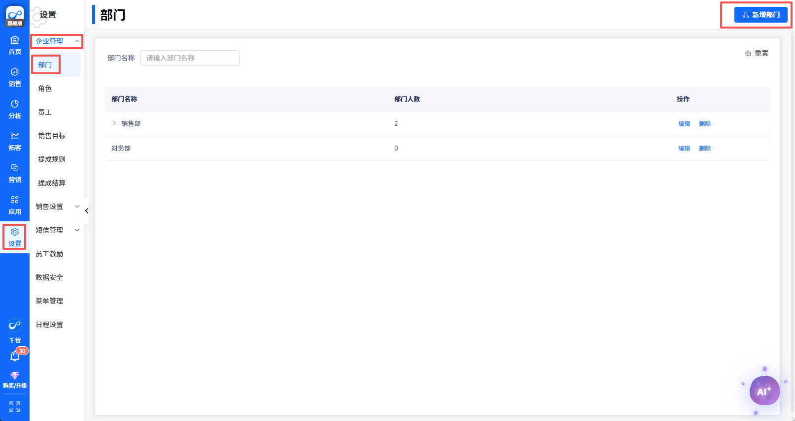系统涵盖以下几大模块: 首页、销售、分析 、 拓客 、 营销 、 应用、设置 、 AI Agent