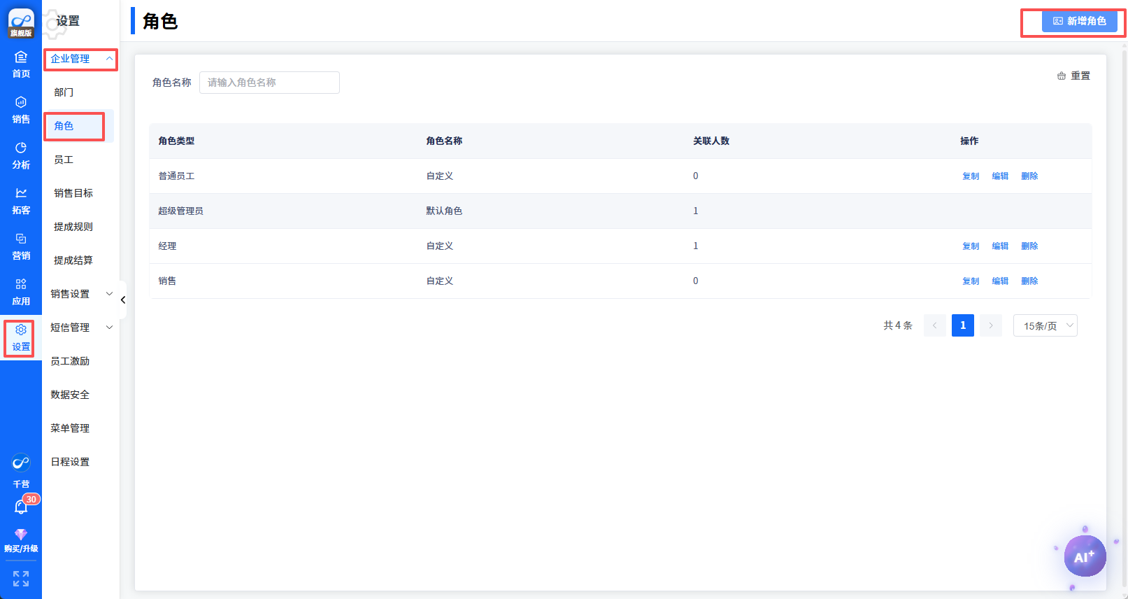 企业人员对系统数据的权限,包括查看、编辑、删除等都需要严格和线下权限对应,千营CRM支持通过角色和个人两个维度控制人员权限: