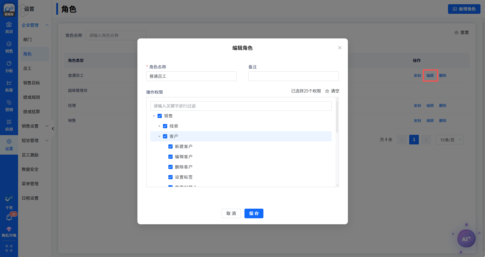 其他角色可参考下图点击【编辑】按钮,通过勾选权限项的方式详细设置。