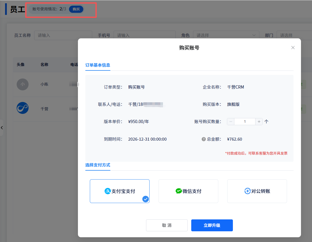 可邀请员工数量受帐号数限制,如邀请人员超出帐号数量,可参考下图增购用户,支付支付宝、微信、对公转账,可开发票。